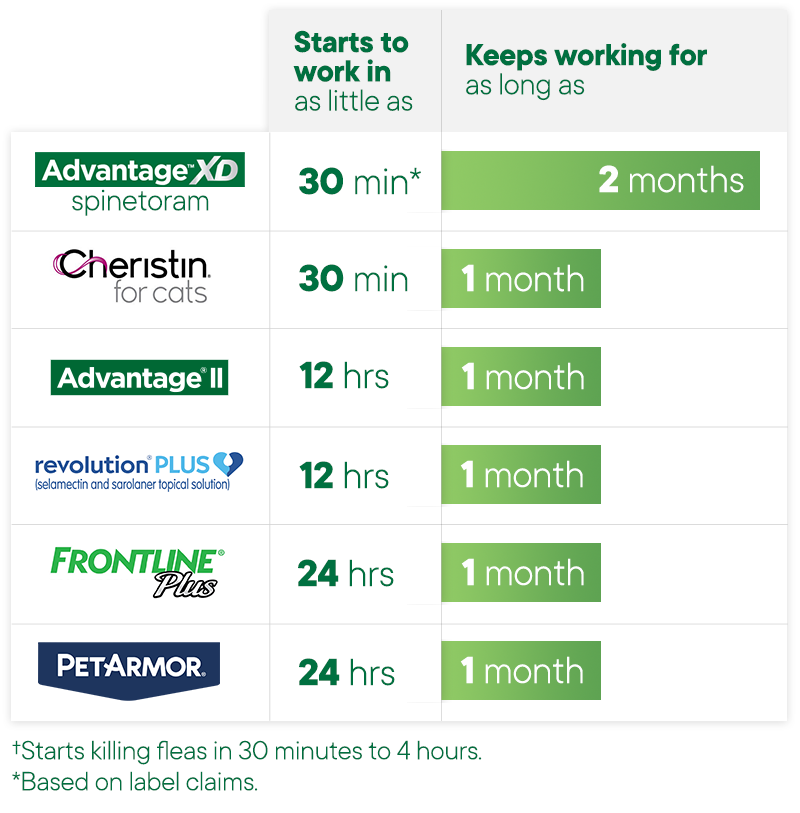 Fast actingAdvantage® XD starts killing fleas in as little as 30 minutes.* Some other topical treatments take as long as 24 hours to start working.†